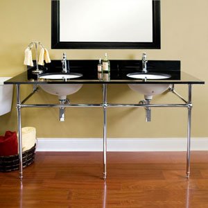 The 60" Art Deco Console Double Sink features two basins providing ample space to share. The marble or granite countertop and brass console stand create a striking look in any bathroom. Console sink includes the brass stand, marble or granite countertop with backsplash, and 2 white undermount basins with bowl clips. Undermount basins have overflows. Undermount basins have unfinished exteriors. Overall dimensions: 61" L x 21" W (front to back) x 34-7/8" H plus 4" backsplash (± 1/2). Available in A-Grade marble and granite colors, thicknesses, and drilling options. See product options below. Each top is carved from a single piece of granite or marble and will have natural variations in the stone. 1" OD brass tubing. Includes optional Chrome overflow covers. Shown in Chrome finish. The console stand is also available in other finishes. See product options below..../ 60" Double Console Sink - 8" Faucet Holes - Brushed Nickel - 3/4" Granite Top - Baltic Green / Sink Hardware